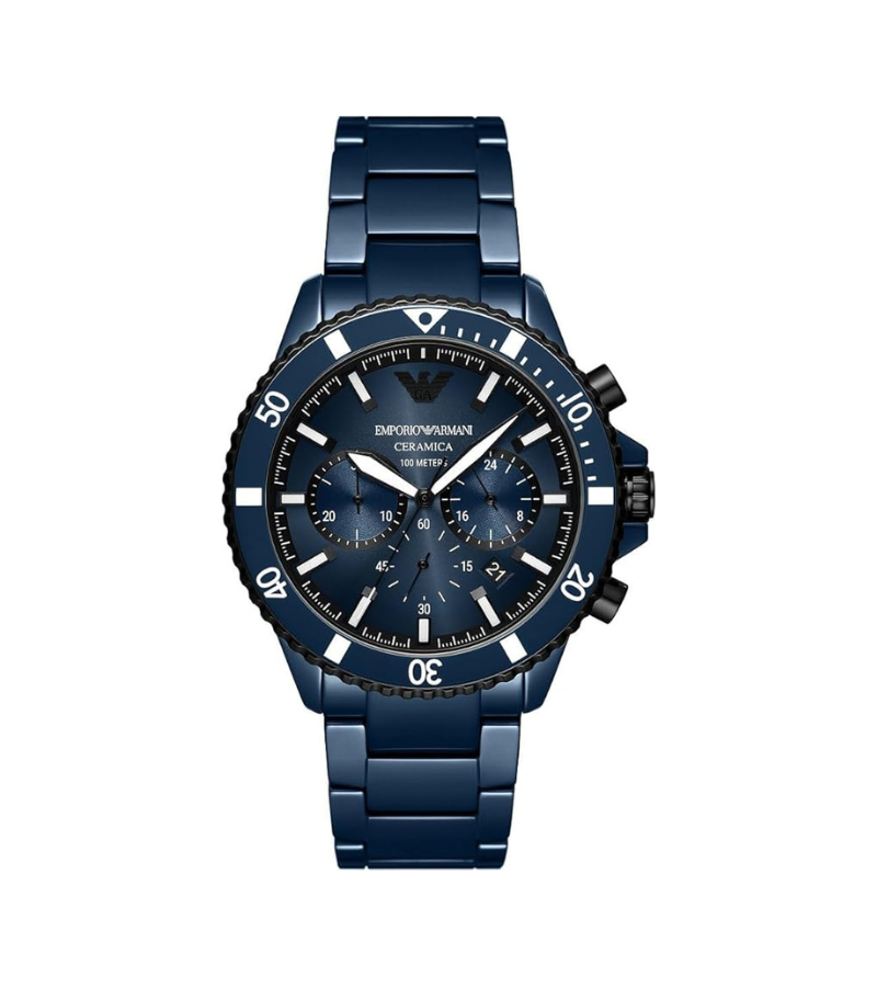 - Boîtier rond en céramique, cadran noir et bleu