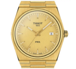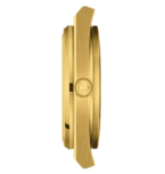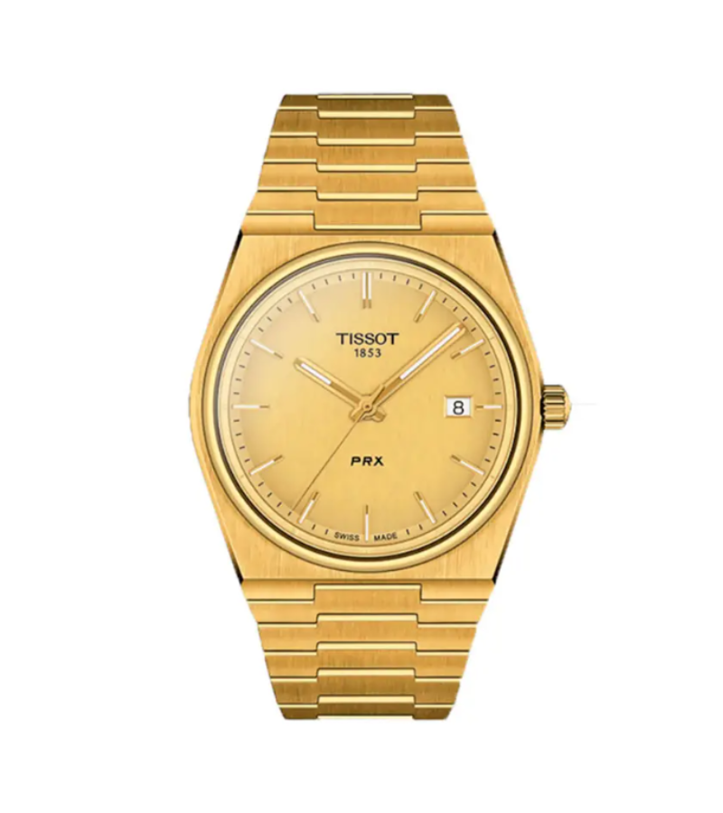 - Mouvement à quartzLa maison Tissot vous propose cette collection PRX avec cette montre T1374103302100. Elle est proposée pour les hommes avec ses dimensions qui sont de 40 mm de diamètre pour une épaisseur de 10.40 mm. Son design est voyant, mais tout en étant chic avec son unique couleur, le dorée. Celle-ci vous donnera un style très élégant pour vous accompagner dans votre quotidien. Son boîtier est en forme tonneau et est en acier inoxydable 316L. De plus, une lunette ronde vient délimiter le boîtier du cadran qui est aussi en acier inoxydable. Sur la droite du boîtier, nous retrouvons sa couronne remontoir permettant de régler les aiguilles et le guichet date présent sur le cadran. Ce cadran vous sera d’ailleurs parfaitement protéger avec son verre saphir plat. Pour finir, son fond de boîte est emboîté et son étanchéité sera de 10 ATM.
